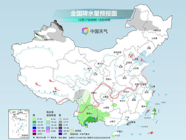 后天,内蒙古东北部、黑龙江中北部、新疆北部和南疆西部山区、甘肃河西等地部分地区有小到中雪或雨夹雪,其中,新疆沿天山地区和伊犁河谷局地有大到暴雪。湖南南部、福建东部和南部、西南地区南部、广西西南部、广东东部和南部、海南岛东部、台湾岛东部等地部分地区有小到中雨,其中,广东东部局地有大雨。