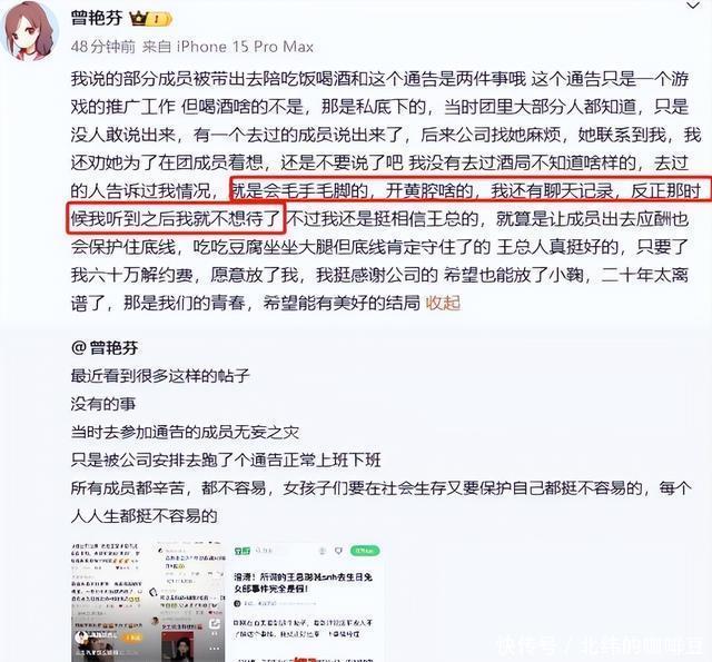 和鞠婧祎陪酒风波 这件事和鞠婧祎的解约脱不了关系,最近,鞠婧祎和丝芭传媒解约不爽消息传开,双方各执一词,一方说合约没到期,一方说公司伪造补充协议。 就在僵持不下的时候,前丝芭成员曾艳芬在社交平台,指控丝芭文化在2014至2017年融资期间, 安排年轻女艺人参加商务饭局,甚至遭遇“动手动脚”。